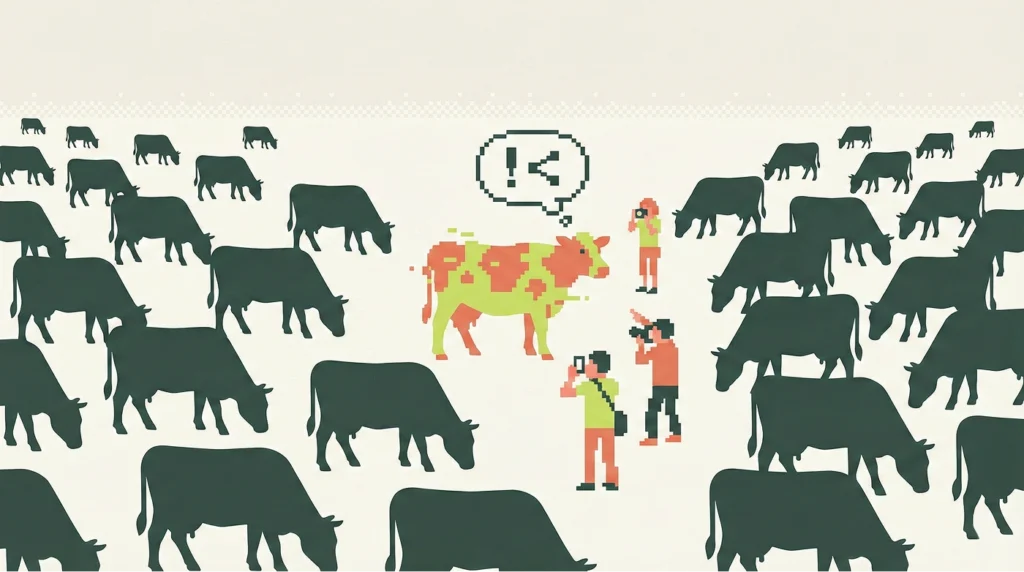 Seth Godin’in efsanevi “Mor İnek” (Purple Cow) teorisi, günümüzün reklam karmaşasında (clutter) hayatta kalmanın tek yolunun “dikkat çekici” (remarkable) olmak olduğunu savunur. Godin’e göre, bir çayırda otlayan yüzlerce kahverengi inek (brown cows) kimsenin ilgisini çekmez; ancak mor bir inek herkesin durup bakmasını ve hakkında konuşmasını sağlar.