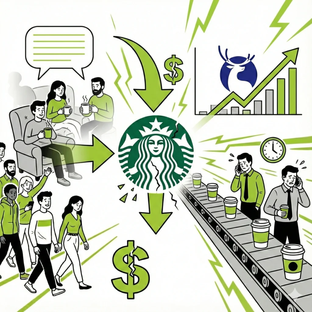 Sebep: “Üçüncü mekan” (ev ve iş arasındaki sosyal alan) vaadini terk edip hız ve verimlilik odaklı bir model benimsemek. Deneyim, işleme dönüştü. Çin’de Luckin Coffee’nin yükselişi (%68 büyüme) yerel rakiplerin gücünü gösterdi.