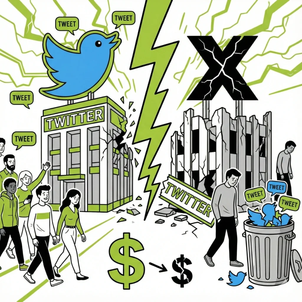 Sebep: Twitter’dan X’e rebrandingte 15 yıllık kültürel sermaye çöpe atıldı. “Tweet” gibi kültüre yerleşmiş terimler terk edildi. Reklam geliri çeyreklik 1 milyar dolardan 600 milyon dolara düştü.